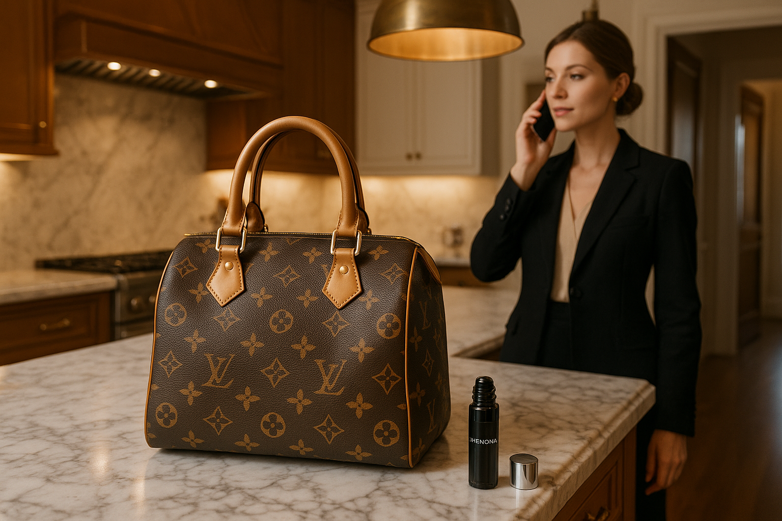 a woman's lxury letter purse in the style of louis vitton is stitting on a counter in a upscale kitchen near an open door in the kitchen an elegant woman is standing next to counter talking on her phone on the counter near the purse is a small black glass perfume roller standing on its end with Harmonie printed on it the silver cap is off and the last thing she will do is use the perfume roller before she leaves the kitchen through the door